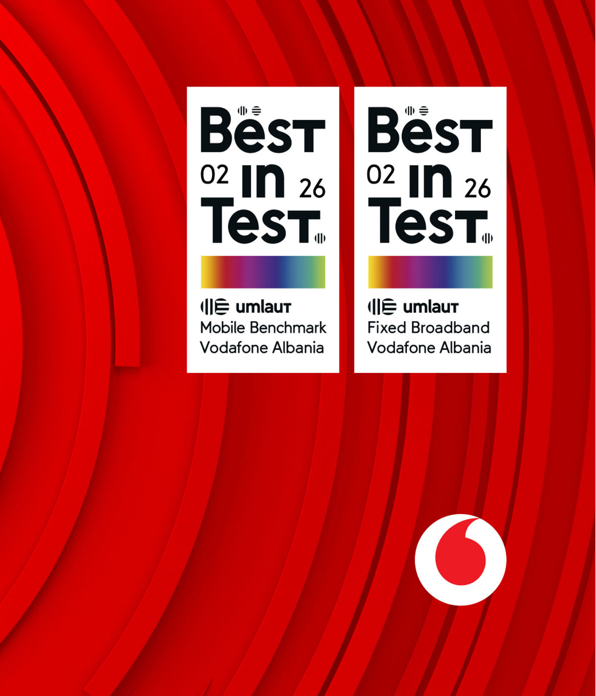 Best in Test, Vodafone Albania i certifikuar si rrjeti më i mire celular dhe fiks nga kompania ndërkombëtare umlaut, Mars 2026. Best in Test, Vodafone Albania i certifikuar si rrjeti më I mire celular nga kompania ndërkombëtare umlaut, Maj 2025. Best in Test. Vodafone Albania i certifikuar si rrjeti më i mirë mobile për 6 vite nga kompania ndërkombëtare umlaut, Shkurt 2023. Gjithashtu, bazuar në Treguesit Statistikor të AKEP, për Tremujorin II 2023, Vodafone ka numrin më të lartë të përdoruesve të aksesit broadband në rrjetet 3G/4G. Best in Fixed: Vodafone Albania është vlerësuar me rezultatin më të lartë të përgjithshëm të besueshmërisë të rrjetit fiks referuar matjeve në shkallë vendi, bazuar në Raportin e Auditit për Rrjetin Fiks në Shqipëri për vitin 2023 nga umlaut. Ultra Shpejtësi në rrjetin fiks si pjesë e operatorëve GPON që mund të arrijnë shpejtësi deri në 2.5Gbps. Vodafone GigaFibra, vlerësohet nga MedUX, si rrjeti fiks me cilësinë më të mirë të eksperiencës në të gjitha kategoritë: upload, download, gaming, streaming, data&OTT.
